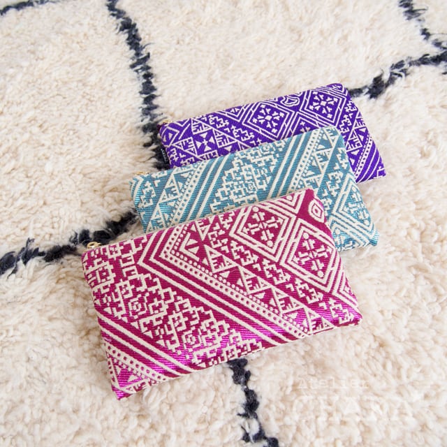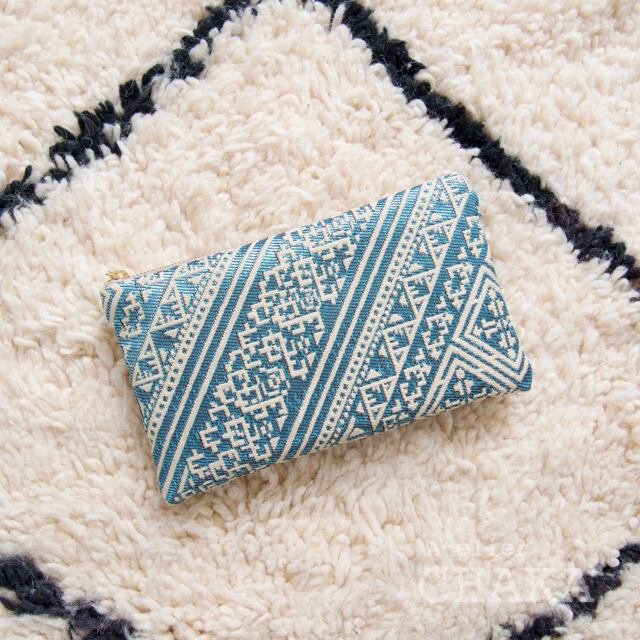 サハラ砂漠の遊牧民族ベルベル人に古くから伝わるトライバル柄をモチーフにした、めずらしい織柄のポーチです。