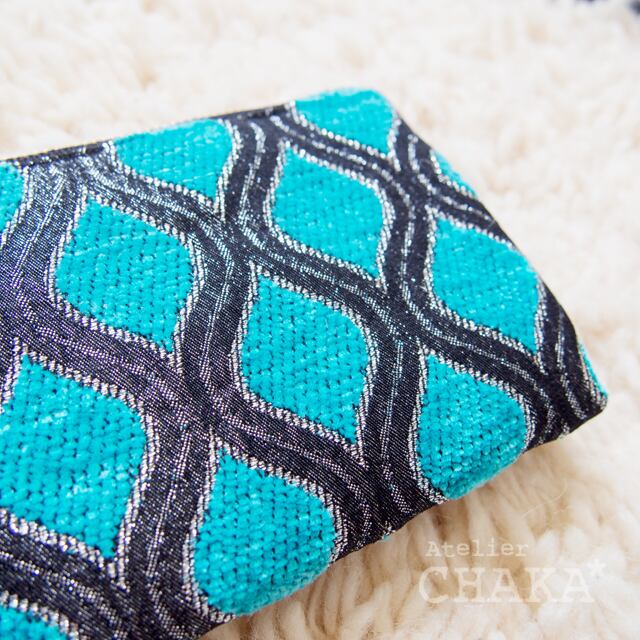 少し起毛したあざやかなターコイズブルーに、キラキラと輝くシルバーと黒のリズミカルな曲線。