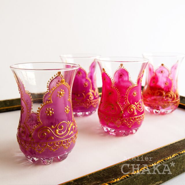 魅惑のチュニジアから、エキゾチックでアラビアンな模様を描いたチャーミングなチャイグラスが届きました。