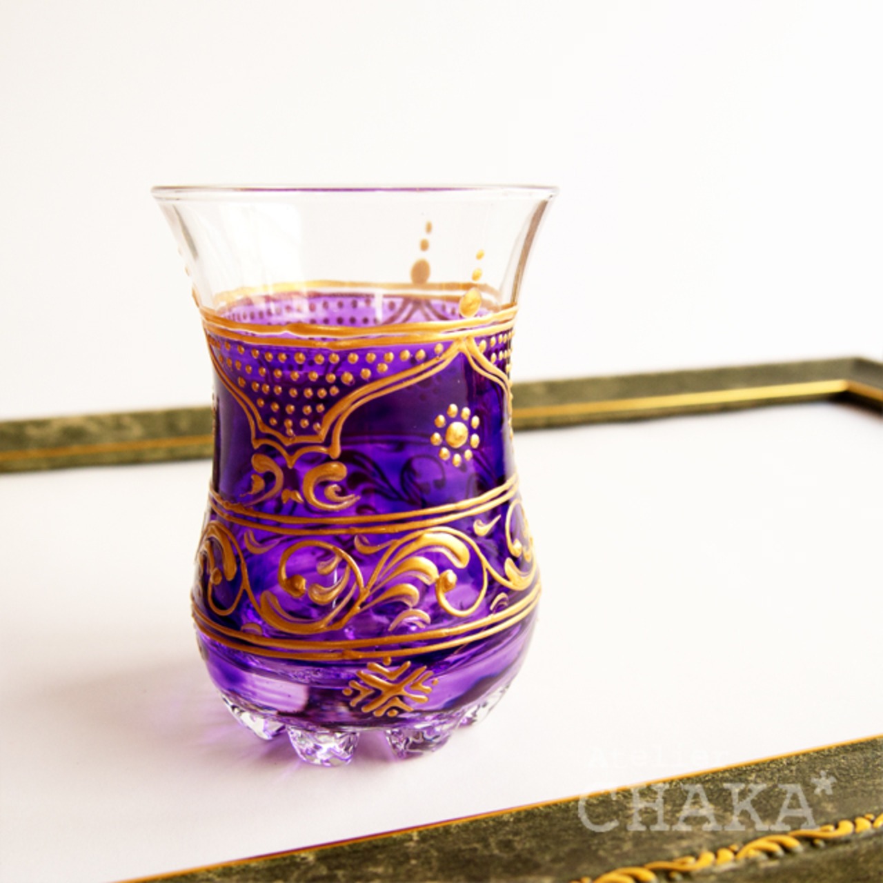魅惑のチュニジアから、エキゾチックでアラビアンな模様を描いたチャーミングなチャイグラスが届きました。